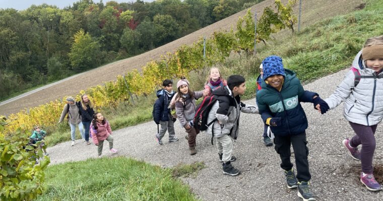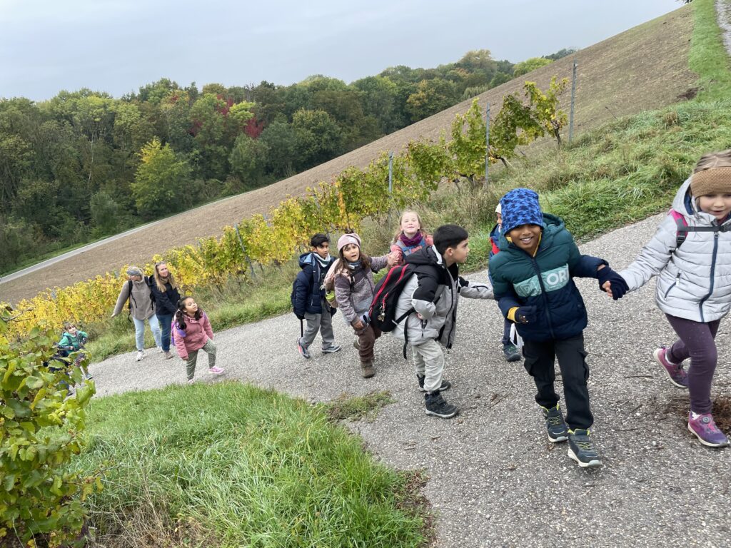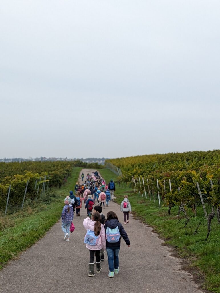 Alle Klassen machten sich, passend zum herbstlichen Wetter, auf verschiedene Routen in und um Wiesloch auf den Weg. Jede Klassenstufe hatte eine eigene Strecke gewählt: Manche Gruppen wanderten durch die Weinberge und genossen den Blick über die herbstlich gefärbten Reben, andere erkundeten die Wege rund um die Stadt oder legten auf einem Spielplatz eine Pause ein.