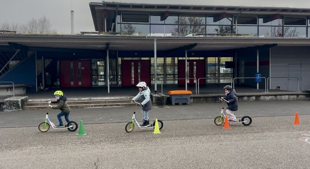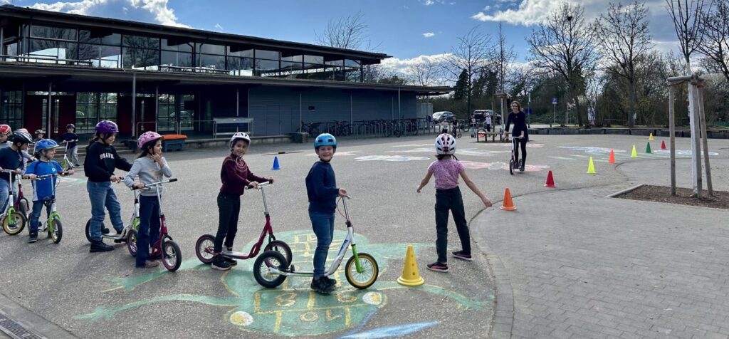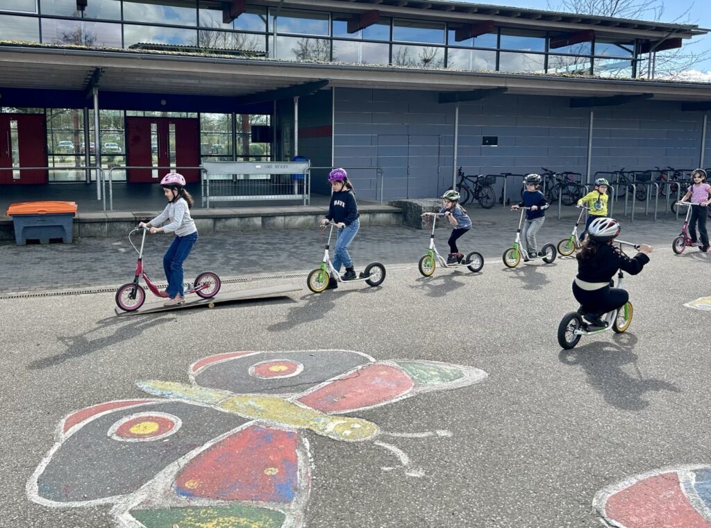 Dafür wurde auf dem Schulhof fleißig geübt und mit dem mitgelieferten Material Stationen und Parcours aufgebaut. Mit viel Spaß und voller Konzentration meisterten die kleinen Fahrerinnen und Fahrer die verschiedenen Hindernisse und übten dabei spielerisch wichtige Fertigkeiten wie: