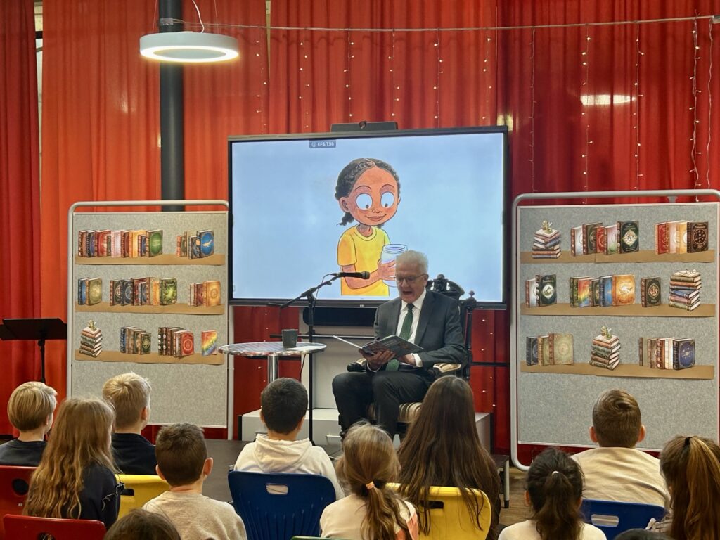 Der Höhepunkt des Besuchs war die anschließende Fragerunde. Die Kinder nutzten die Gelegenheit, um dem Ministerpräsidenten „Löcher in den Bauch zu fragen“. Herr Kretschmann beantwortete geduldig und ausführlich alle neugierigen Fragen der Kinder.Zum Abschied lobte er die Beiträge und das Engagement der Kinder sowie die gesamte Schulgemeinschaft.In dieser Woche wurde jedoch nicht nur von Herr Kretschmann vorgelesen. Auch die Lehrkräfte unserer Schule bereiteten für ihre Klasse jeweils einen gesamten Vorlesetag im Klassenzimmer vor. Dort wurde jeweils ein spannendes Buch vorgelesen und die Kinder durften danach meist kreativ werden, indem sie passende Bastelarbeiten oder andere kreative Projekte dazu umsetzten. So wurde das Lesen in der ganzen Schule auf vielfältige Weise gefeiert und den Kindern ans Herz gelegt.