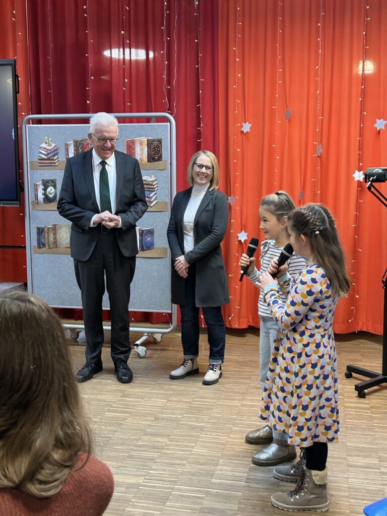 Die Begrüßung war musikalisch und feierlich: Unser Schulchor und unser Orchester präsentierten dem hohen Gast eine beeindruckende Darbietung der „Ode an die Freude“.Anschließend nahm sich Herr Kretschmann viel Zeit für unsere Schülerinnen und Schüler. Er las den Kindern aus dem Buch „Deckel drauf und abspülen!” von Simone Welters vor und führte ein angeregtes Gespräch über die Themen des Buches.