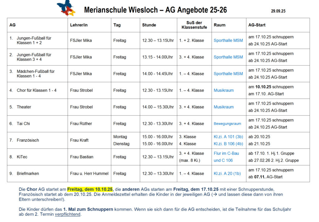 Zu Beginn des Schuljahres kann in die AGs reingeschnuppert werden. Die Anmeldung für eine AG muss von den Eltern unterschrieben werden und wenn ein Kind angemeldet ist, so ist die Teilnahme zur AG verpflichtend.